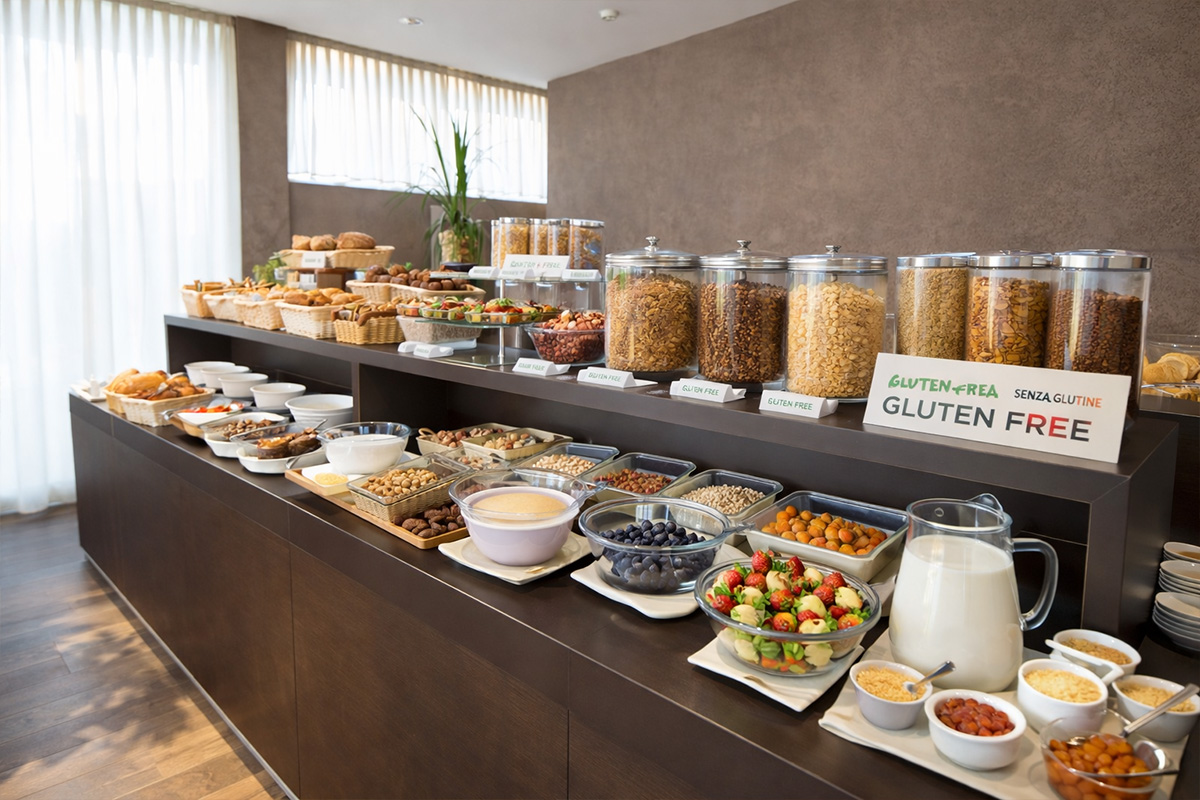 All'Hotel Sorriso il senza glutine diventa eccellenza! Pasta fresca fatta a mano, specialità di mare croccanti e dolci artigianali ogni giorno. Un menù ricco con antipasti, primi e secondi a scelta, più buffet di dessert e frutta. Qui il piacere della tavola è davvero per tutti.